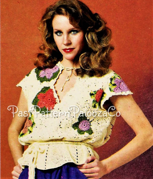 Vintage Crochet Pattern Womens Pretty Flower Blouse Top PDF Instant Digital Download Cinched Waist Floral Hexagon Motifs Cotton Thread