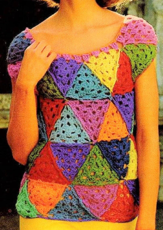 Vintage Crochet Pattern Womens Rainbow Triangles Patchwork Top PDF Instant Digital Download Retro Boho Granny Squares Hippie Jumper 5 Ply