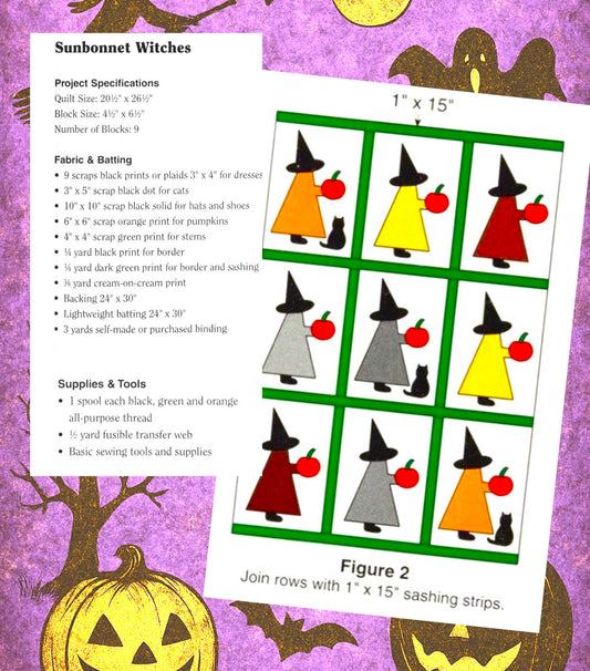 Vintage Halloween Sewing Pattern Sunbonnet Sue Witches Quilt PDF Instant Digital Download Lap Quilt or Wall Hanging Witch Black Cat Applique