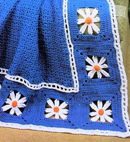 Vintage Crochet Afghan Pattern Gerber Daisy Squares Border Throw PDF Instant Digital Download Daisies Motif Flower Blanket 50x66 10 Ply