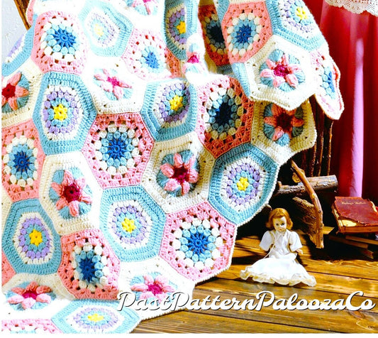 Vintage Crochet Afghan Pattern Hexagon Flower Granny Squares PDF Instant Digital Download Floral Motif Sampler Design 45x70 10 Ply