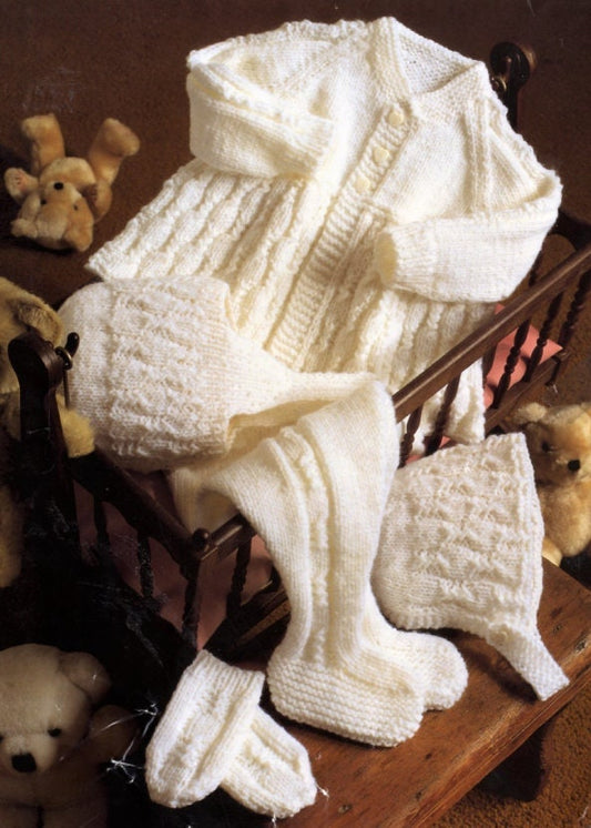 Vintage Knitting Pattern Knit Baby Matinee Coat Leggings Bonnet Helmet Mitts Set PDF Instant Digital Download 0-9m DK