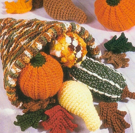 Vintage Crochet Pattern 11" Thanksgiving Cornucopia Pumpkin Squash Gourd Autumn Leaves Amigurumi PDF Instant Digital Download Fall Harvest