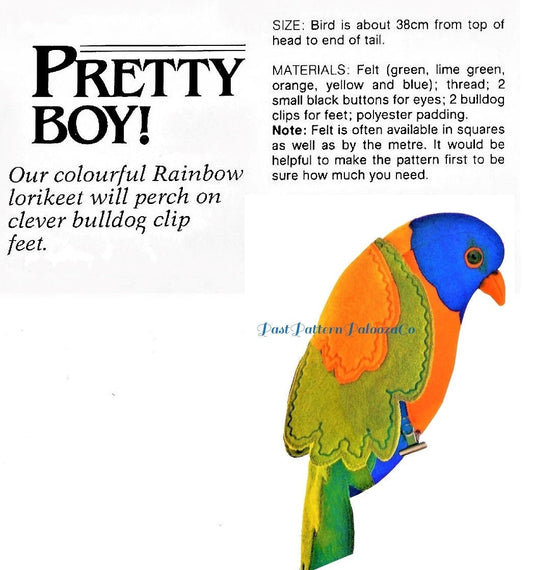 Vintage Sewing Pattern 15" Parrot Bird Soft Sculpture Plush Toy Doll PDF Instant Digital Download Rainbow Lorikeet Felt Fabric