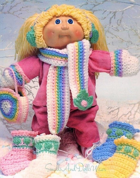 Vintage Crochet Pattern 16" Soft Sculpture Doll Winter Rainbow 5 Piece Accessories Set PDF Instant Digital Download Cabbage Patch Kids 4 Ply