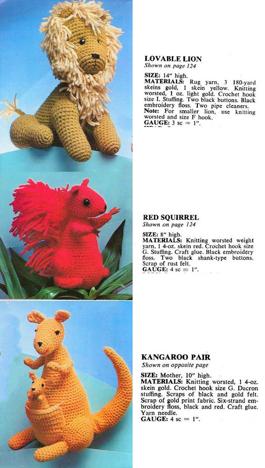Vintage Crochet Pattern 8-14" Lion Squirrel Kangaroo Soft Toy Dolls Amigurumi Animals PDF Instant Digital Download 10 Ply