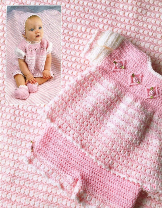 Vintage Crochet Pattern Baby Girl Roses and Dots 5 Piece Layette Set PDF Instant Digital Download Dress Pants Bonnet Booties Afghan 0-12 m