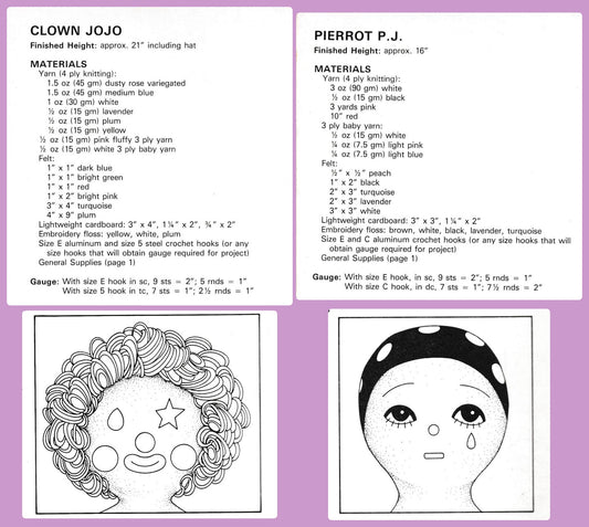Vintage Crochet Pattern Circus Clown and French Mime Pierrot Clown Dolls PDF Instant Digital Download Two Amigurumi Plush Stuffed Toys 4 Ply