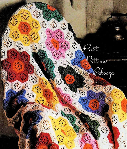 Vintage Crochet Pattern Colorful Hexagon Flower Blanket Granny Square Afghan PDF Instant Digital Download Scrap Yarn Throw 69x54 5 Ply