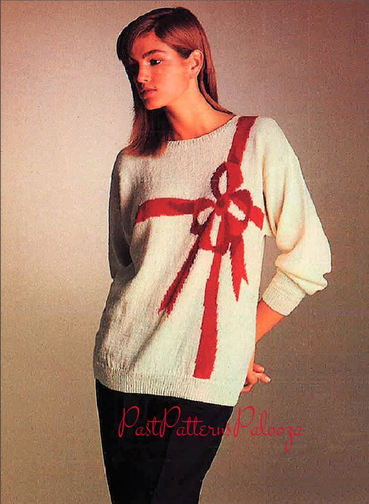 Vintage Knitting Pattern Womens Christmas Present Bow Motif Sweater PDF Instant Digital Download Holiday Pullover Jumper 3 Ply