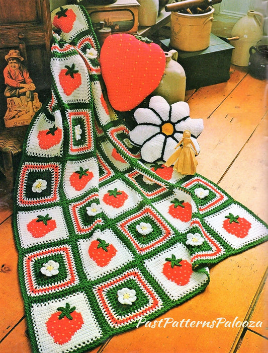 Vintage Crochet Pattern Strawberries Rosette Blossoms Afghan Granny Squares PDF Instant Digital Download Berries Flowers Blanket 10 Ply