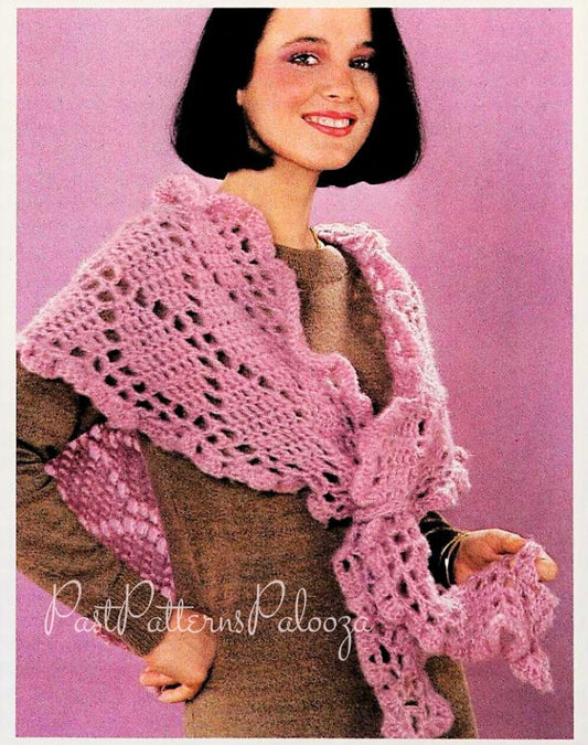 Vintage Crochet Pattern Womens Feminine Shawl Openwork Diamonds PDF Instant Digital Download Ruffled Border Ring Tie Front 5 Ply
