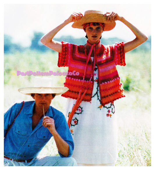 Vintage Crochet Pattern Womens Fiesta Striped Jacket Tunic Peruvian Top with Necktie Belt PDF Instant Digital Download Retro 70s Boho Summer