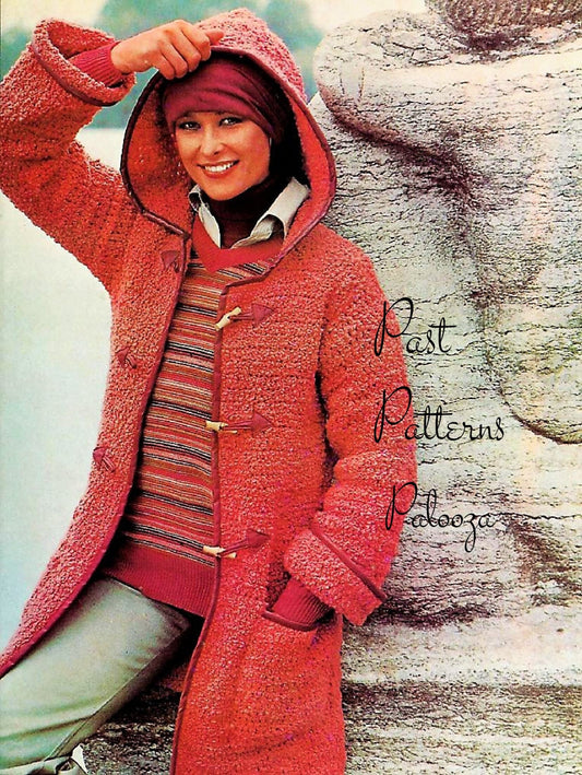Vintage Crochet Pattern Womens Hooded Boucle Duffle Coat PDF Instant Digital Download Retro Leather Trim 10 Ply