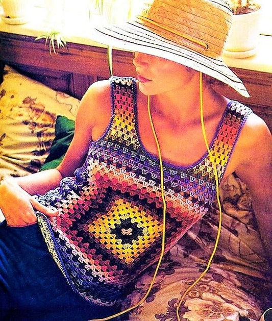 Vintage Crochet Pattern Womens Rainbow Granny Square Sleeveless Vest Tank Top PDF Instant Digital Download 1970s Cotton Thread Boho Chic