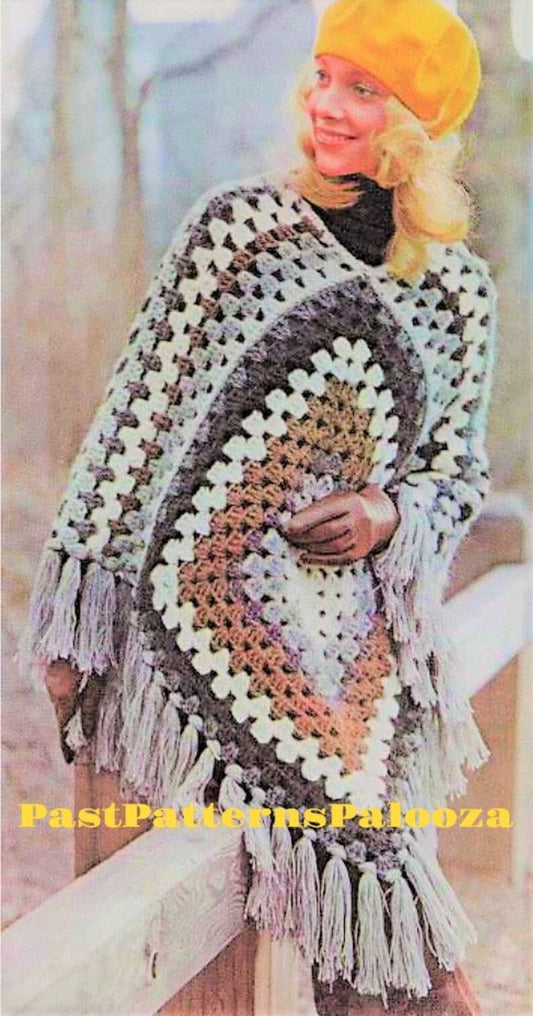 Vintage Crochet Pattern Womens Quick Easy Granny Square Poncho PDF Instant Digital Download Retro Boho 1970s Fringed Wrap Chunky 12 Ply