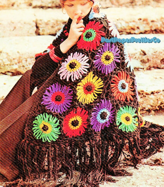 Vintage Crochet Pattern Womens Rainbow Posy Shawl Dahlia Flower Wheels Large Motifs PDF Instant Digital Download Hippie Wrap Boho Chic