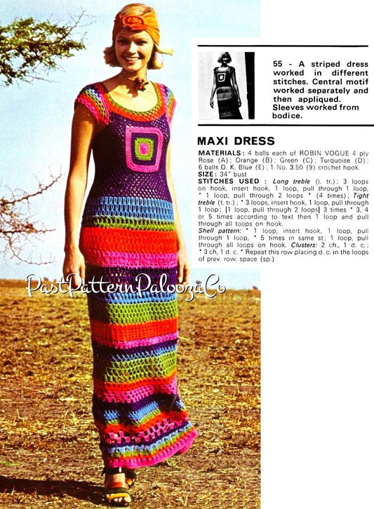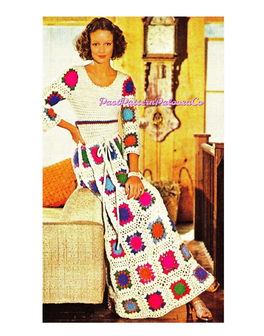 Vintage Crochet Pattern Womens Rainbow Granny Square Maxi Dress PDF Instant Digital Download Groovy Boho Long Festival Gown 5 Ply