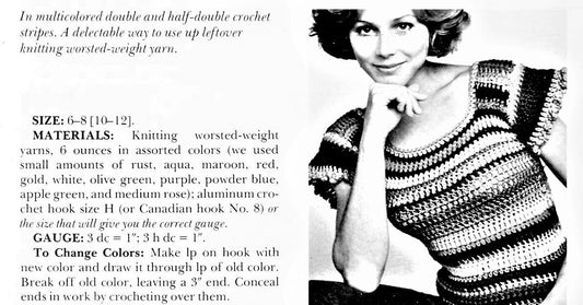 Vintage Crochet Pattern Womens Ruffle Cap Sleeved Short Striped Summer Top PDF Instant Digital Download Boho 1970s Bold Stripes DK 10 Ply