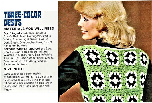 Vintage Crochet Pattern Womens Retro Tri-Color Granny Square Vests Collared & Fringed PDF Instant Digital Download Hippie Boho Chic 10 Ply