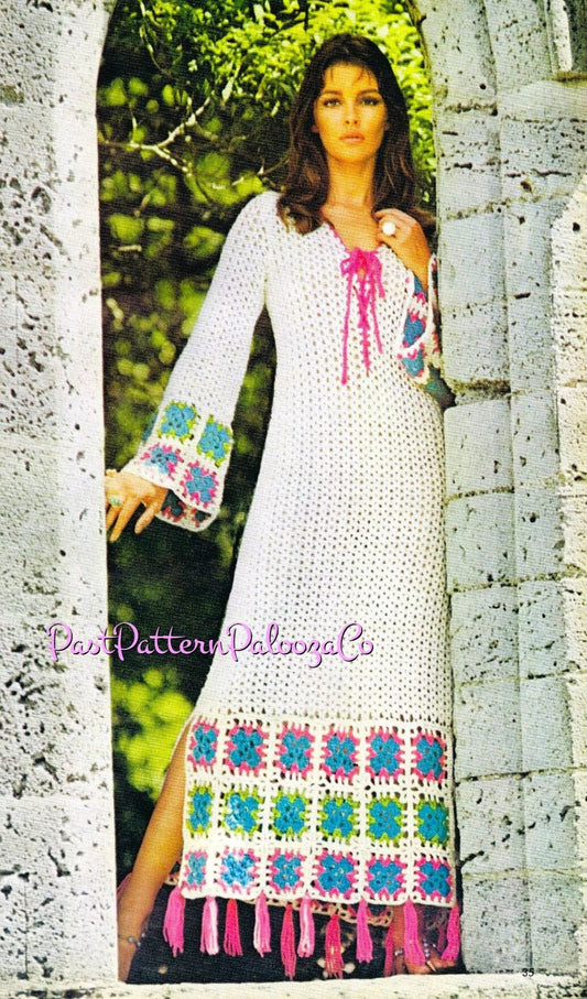 Vintage Crochet Pattern Womens Romantic Medieval Maxi Gown Granny Squares Trim Dress Retro Guinevere Tunic PDF Instant Digital Download