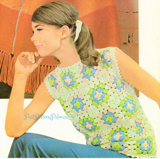 Vintage Crochet Pattern Womens Simple Shell Granny Square Sleeveless Top PDF Instant Digital Download Groovy Boho Scrap Yarn 10 Ply