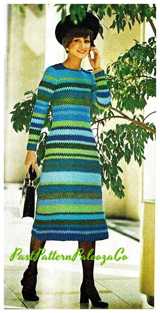 Vintage Crochet Pattern Womens Striped Sea and Sky Midi Dress PDF Instant Digital Download Retro Striped Longuette Gown Maxi Midi or Mini