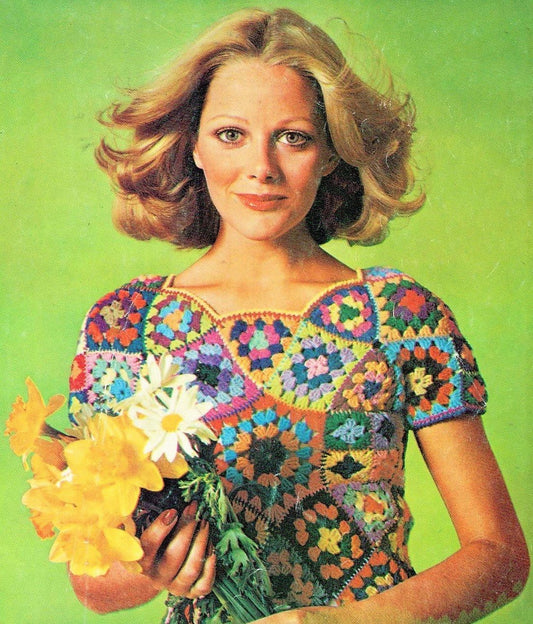 Vintage Crochet Pattern Womens Stained Glass Granny Square Shell Top PDF Instant Digital Download Groovy Gypsy Boho Mosaic Scrap Yarn 10 Ply
