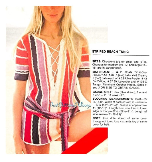 Vintage Crochet Pattern Womens Striped Lace Up Belted Beach Tunic Mini Dress Bikini Cover Up PDF Instant Digital Download Boho Hippie Chic