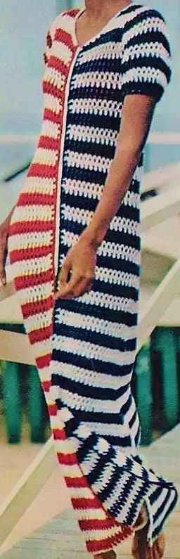Vintage Crochet Pattern Womens Tricolor Maxi Dress or or Beach Cover Up Nautical Stripes PDF Instant Digital Download 70s 10 Ply