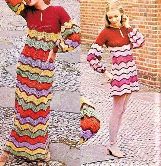 Vintage Crochet Pattern Womens Zig-Zag Chevron Stripe Long Maxi or Short Mini Dress PDF Instant Digital Download Hippie Gypsy Chic 5 Ply DK