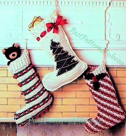 Vintage Crochet Patterns 14" Keepsake Christmas Stockings Candy Cane Stripes Tree Popcorn Stitch PDF Instant Digital Download 10 Ply