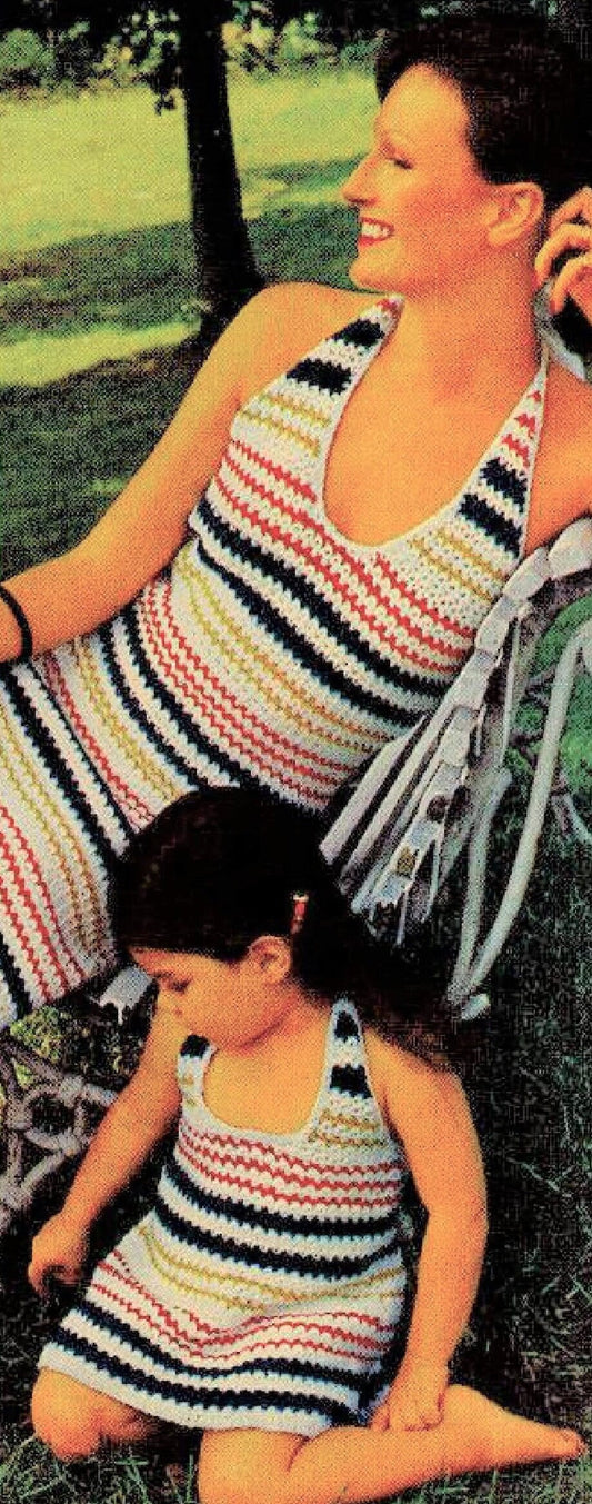 Vintage Crochet Patterns Womens Girls Stripe Banded Maxi Halter Dress PDF Instant Digital Download Groovy Mod Boho Chic 5 Ply