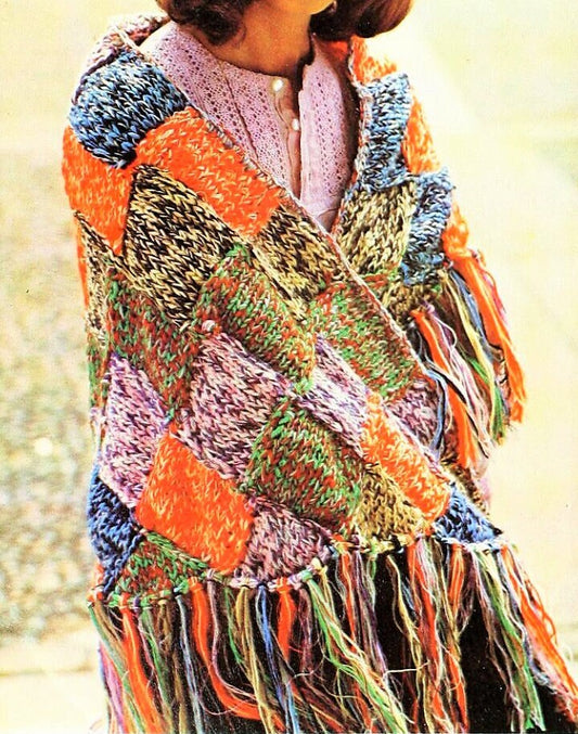 Vintage Knitting Pattern Womens Patchwork Squares Fringed Shawl PDF Instant Digital Download Retro Boho Wrap Cotton DK