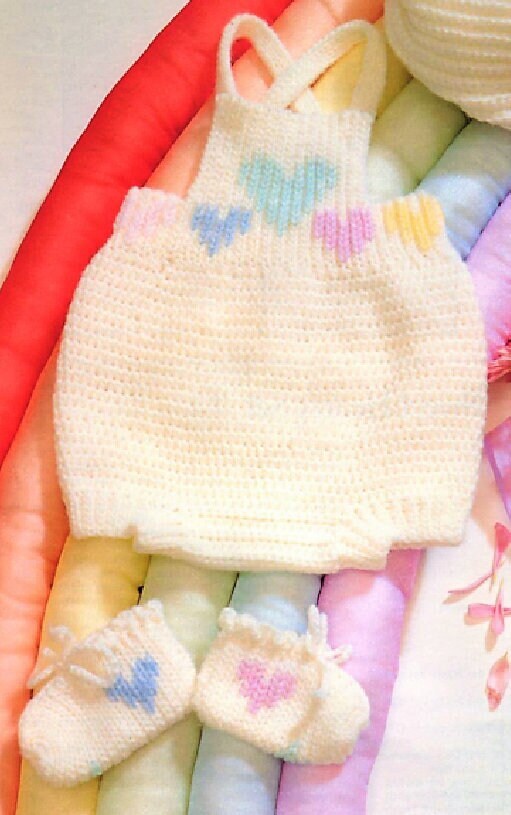 Vintage Crochet Pattern Baby Girl Hearts Bubble Romper Bonnet Booties Outfit Set PDF Instant Digital Download 0-6 months 5 Ply