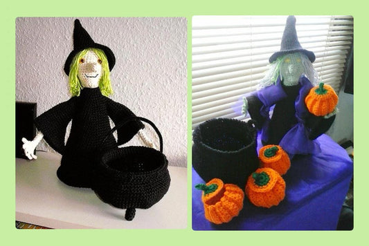 Vintage Crochet Pattern Halloween 14" Witch Doll with Cauldron & Pumpkin Candy Holders PDF Instant Digital Download