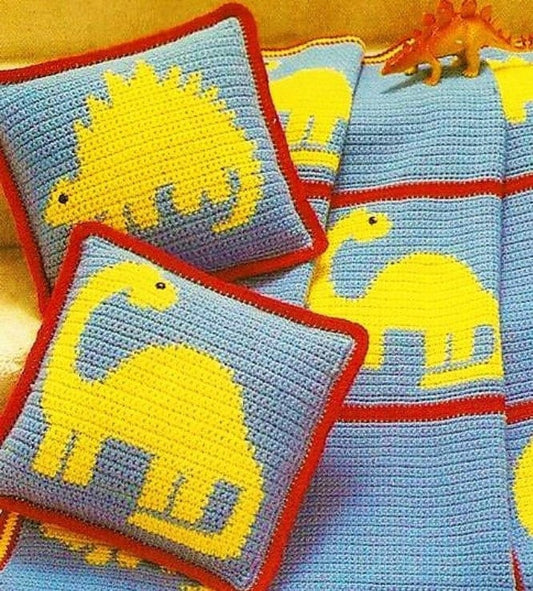 Vintage Crochet Pattern Kids Toddler Dinosaur Squares Afghan Blanket and Pillow Set PDF Instant Digital Download 37x49 10 Ply