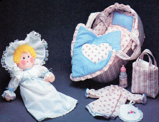 Vintage Sewing Pattern 15" Fabric Baby Soft Sculpture Toy Doll and Layette Moses Basket Bed and Accessories PDF Instant Digital Download