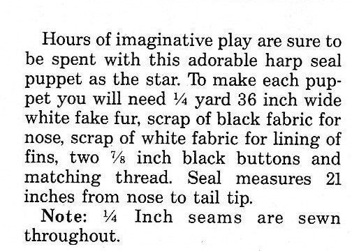 Vintage Sewing Pattern 21" Plush Baby Harp Seal Hand Puppet Faux Fur Fabric PDF Instant Digital Download Arctic Animal Soft Puppet Toy