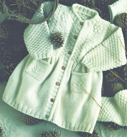 Vintage Knitting Pattern Knit Baby Girl Coat Dress PDF Instant Digital Download Embroidered Detail Moss Rib Stitch 6m - 2 yrs DK