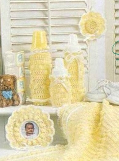 Vintage Crochet Pattern Sunny Popcorn Hearts Baby Blanket Afghan Nursery Set Bottle Covers Picture Frame PDF Instant Digital Download 5 Ply