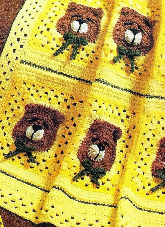 Vintage Crochet Sleepy Teddy Bears Baby Afghan Blanket PDF Instant Digital Download Bear Head Granny Squares 36x38 10 Ply