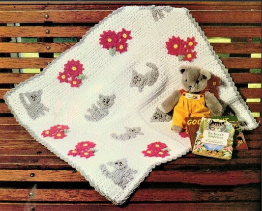 Vintage Crochet Pattern Cats and Flowers Baby Blanket Afghan PDF Instant Digital Download Crib Cot Cover Applique Kittens 30x39 10 Ply