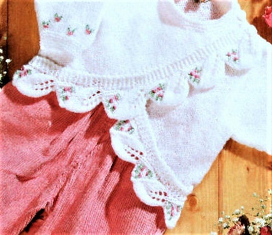 Vintage Knitting Pattern Baby Girl Wrap Over Cardigan Coat Top PDF Instant Digital Download Rosebud Leaf Border Trim 0 - 2 yrs DK 8 Ply