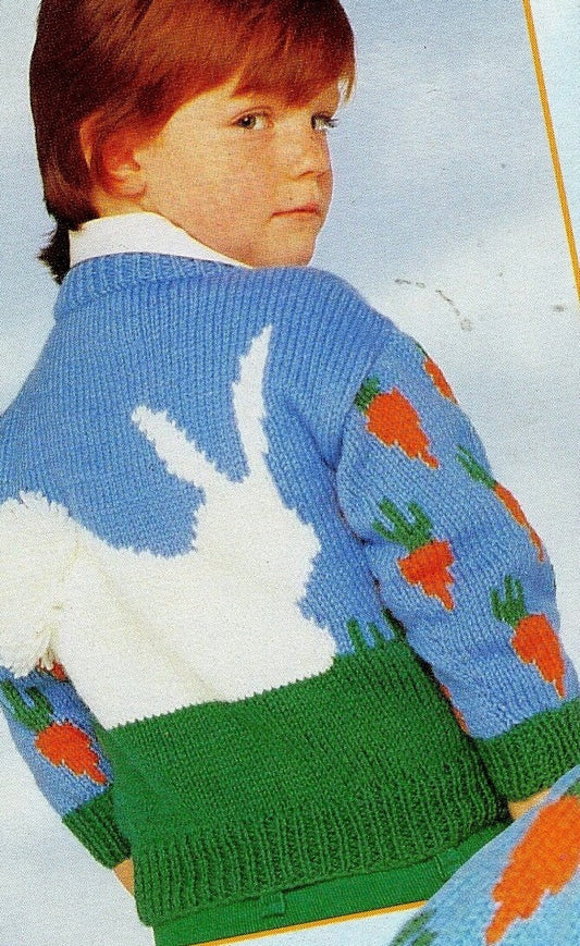 Vintage Knitting Pattern Childs Pullover Bunny Rabbit Carrots Sweater PDF Instant Digital Download Animal Motif Jumper 3-8 yrs 10 Ply