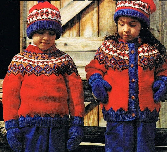 Vintage Knitting Pattern Toddler & Big Kids Chunky Sweater Hat Mitts Sets Country Brights FairIsle PDF Instant Digital Download 9m-12 yrs