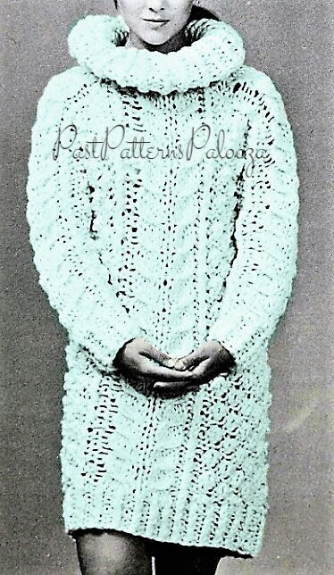 Vintage Knitting Pattern Womens Irish Fisherman Aran Mini Dress Retro Roll Collar Long Sleeves PDF Instant Digital Download Big Needle Knits