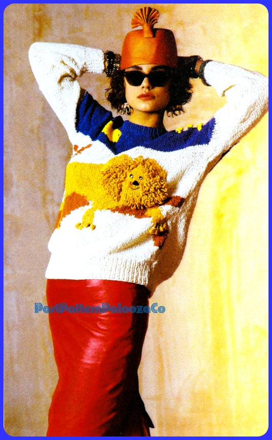 Vintage Knitting Pattern Womens Lion Sweater PDF Instant Digital Download Retro Big Cat Animal Motif Pullover Jumper Loopy Mane 10 Ply