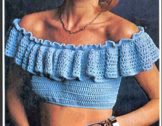 Vintage Crochet Pattern Womens Off Shoulder Ruffle Midriff Top PDF Instant Digital Download Retro Summer Boho 1970s Cotton Thread No. 4