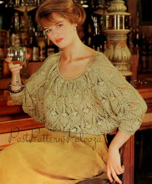 Vintage Crochet Pattern Womens Pretty Pineapple Lace Blouse PDF Instant Digital Download Dressy Top Dolman Sleeves 4 Ply